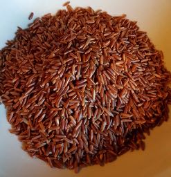 Det röda riset jag har använt mig av, är en italiensk-odlad sort. Från början är det ett vildris, men den mycket goda och nötigt smaken har gjort riset så populärt att man börjat odla det. Det är ett opolerat fullkornsris där enbart det allra yttersta skalet är borttaget, vilket innebär att det alltså är mycket mer fiberrikt än vitt ris, det innehåller också mer vitaminer och mineraler. Det ger inte heller den snabba blodsockerhöjningen som vitt ris ger, utan är en kolhydrat med bra och långsam blodsockerhöjning. Kan varmt rekommendera det här riset, som passar till både kött och grönsaker och det används ofta i asiatisk matlagning.