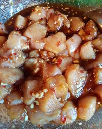 Blanda samman marinaden och lägg kycklingbitarna däri och låt det hela marinera minst 30 min, gärna upp till 1 timma.