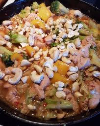 Blanda ned cashewnötterna och servera woken med riset.