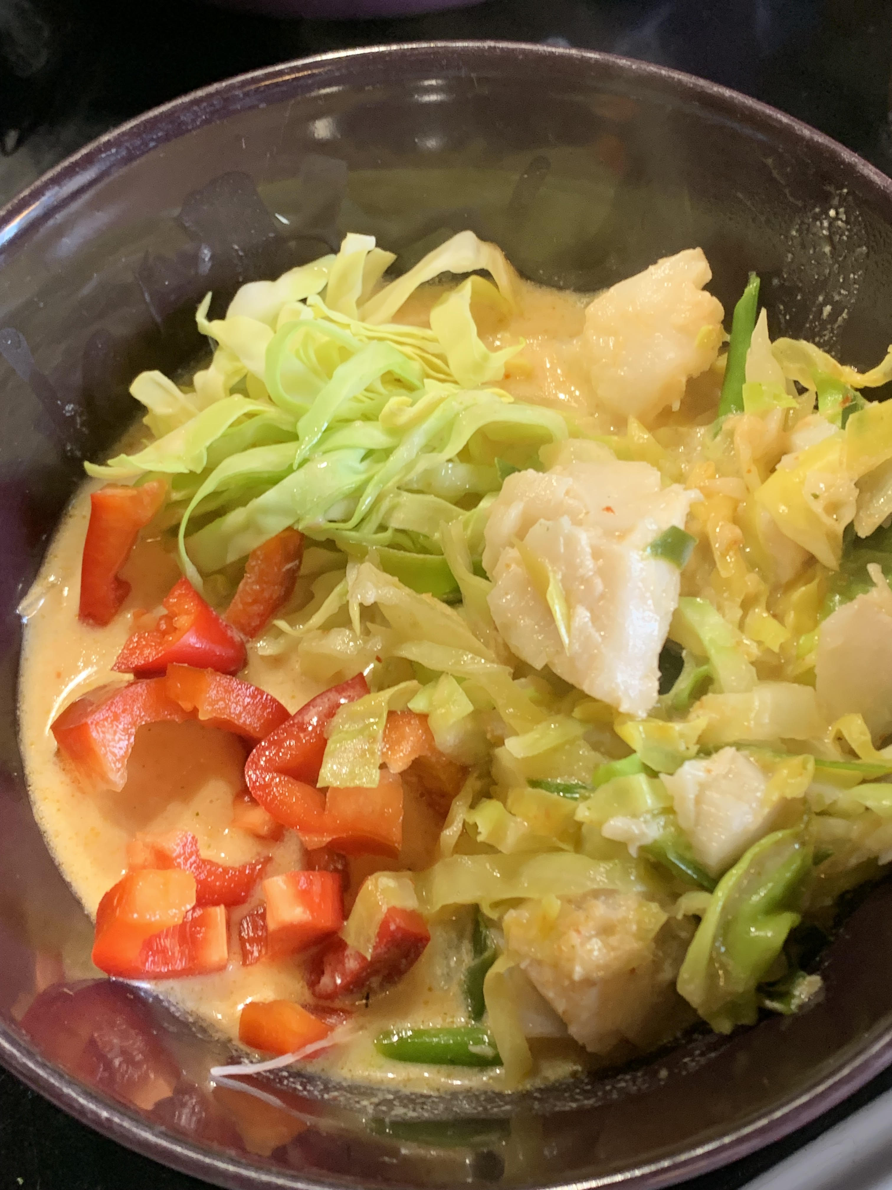 Har du provat ramen ännu? Du vet det japanska sättet att äta typ soppa på, där man lägger olika grönsaker m m fördelat i olika högar i en skål och häller buljong över (typ)? Det är gott, men jag har hittat ett recept på en variant som heter Laksa där själva soppgrunden (eller vad man ska kalla det) även innehåller kokosmjölk eller kokosgrädde.