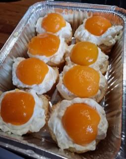 Vispa grädden ganska hårt och lägg en klick på varje bakelse. Lägg sedan på en aprikoshalva.