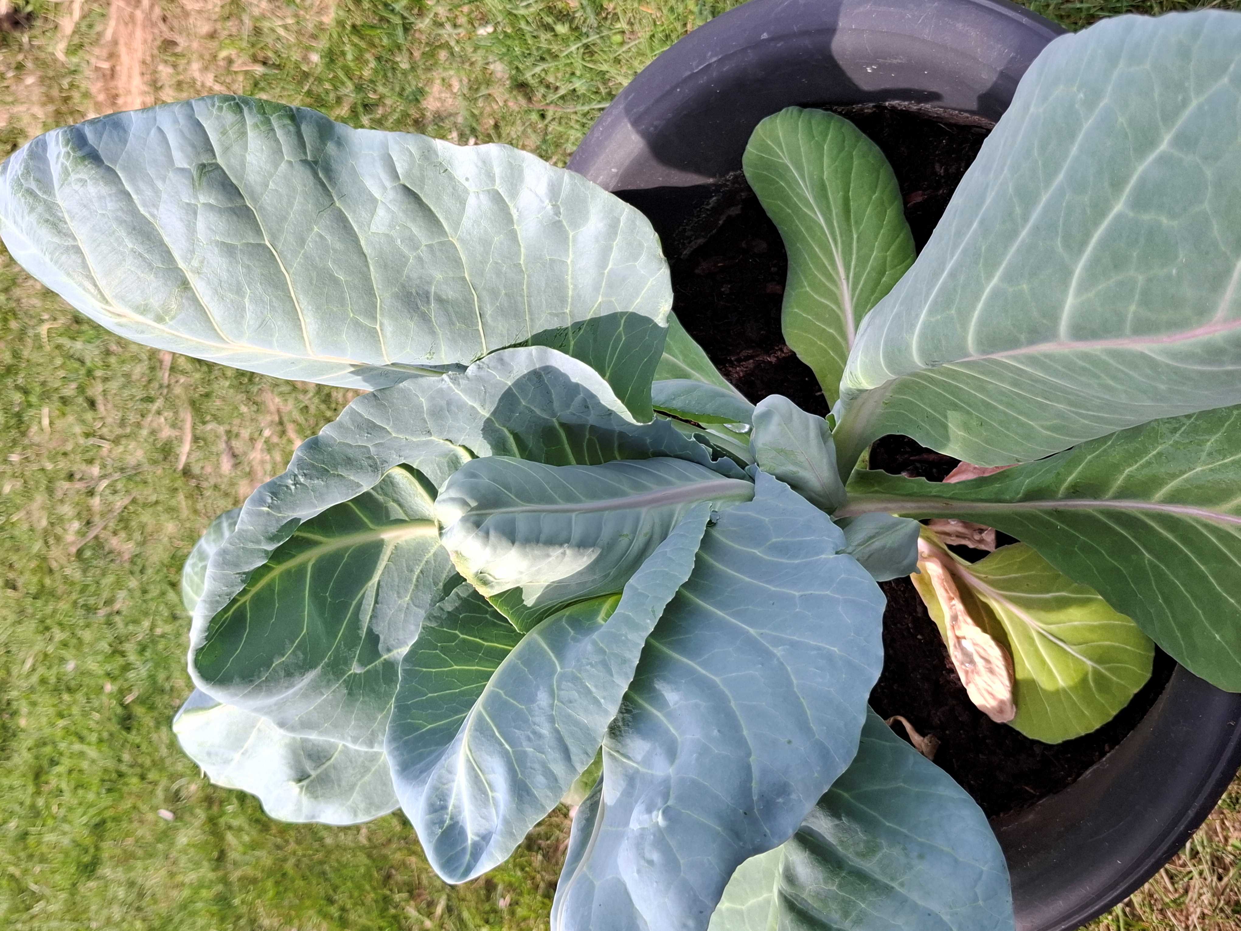 Årets första spetskål på gång i kruka. Såddes i höstas och fick övervintra som liten planta i frostfritt växthus och nu på våren har jag börjat vattna och då kommer den igång.