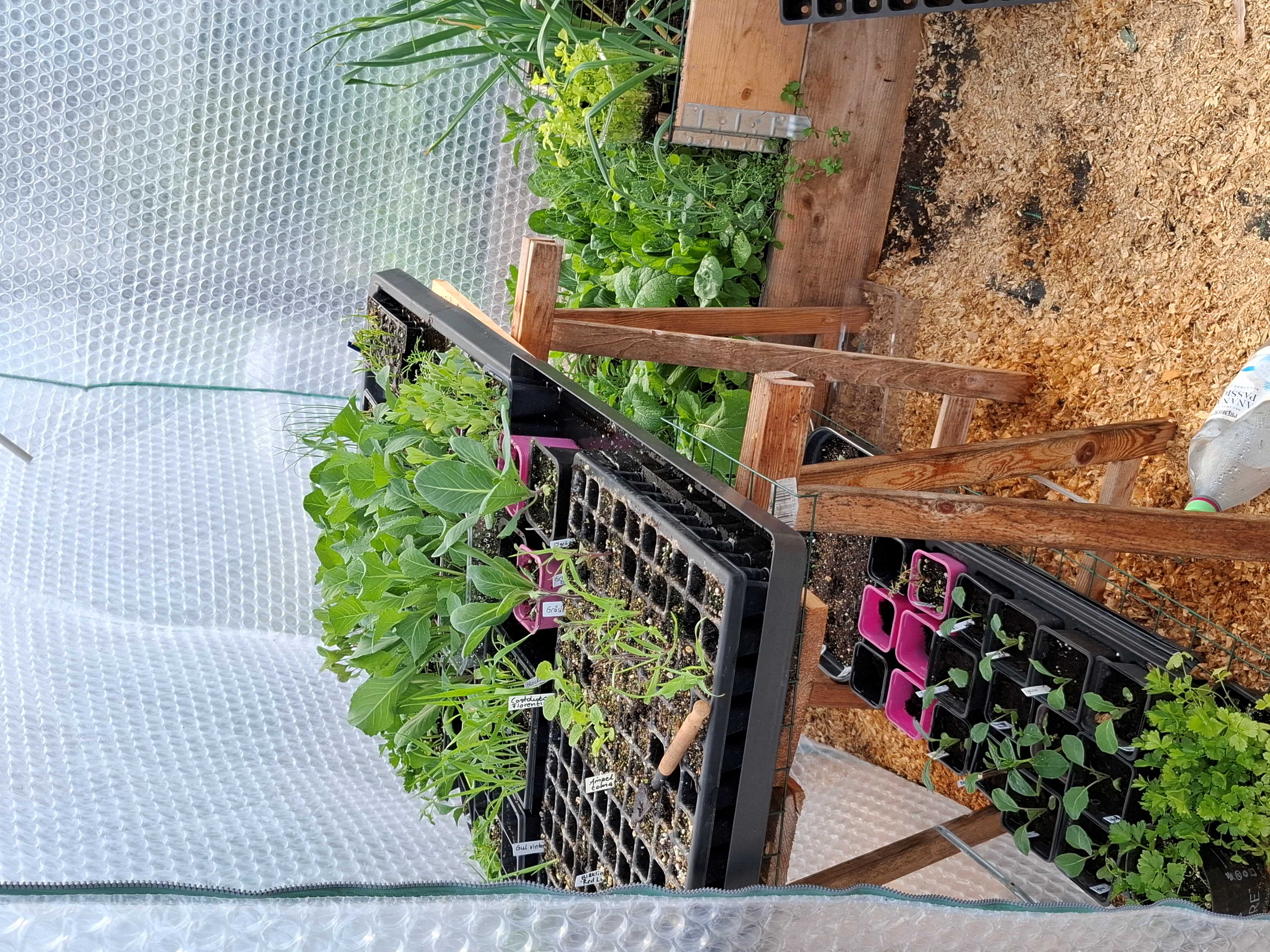 Jag försår nästan alla grödor, ja de som går att förså då. Morötter, palsternacka o s v har känslig rötter som letar sig djupt ner och de vill inte bli störda av en omplantering så de direktsår man. Men annars försår jag allt från bladgrönt till rödbetor. Det beror dels på sniglarna här, men även för att det är så bra att ha små plantor att sätta ut när man skördat av något i odlingen ute. Inga tomma ytor!
