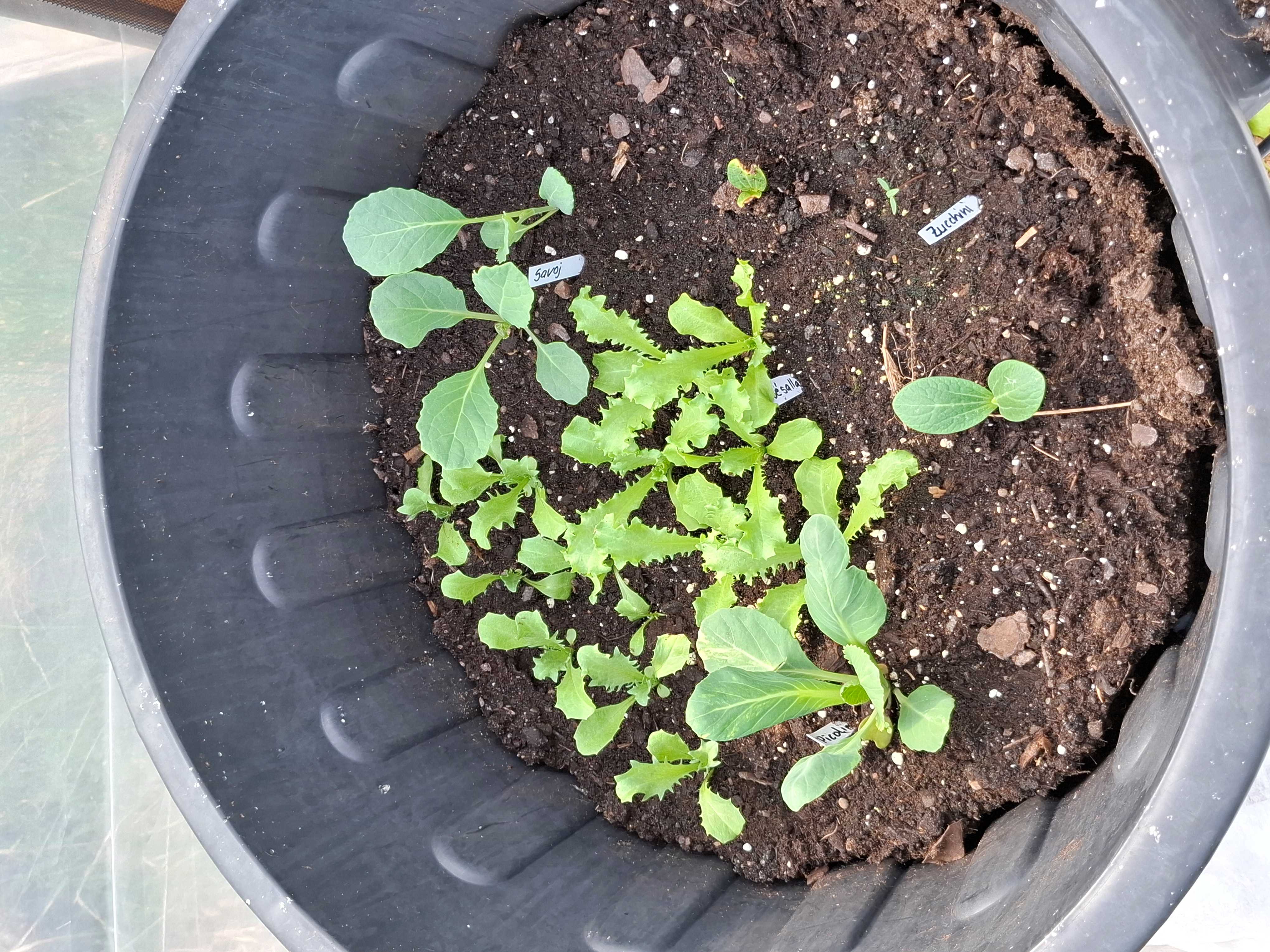 Om man odlar intensivt och mycket krävs även mycket näring till jorden. Jag använder mig av Bokashi. Jag har en egen liten "jordfabrik" bland annat i tunnelväxthuset. Det är en tunna som jag tömt mina bokasi-hinkar i ett par gånger och så varvat med jord. Då blir det under den varmare årstiden till jord rekord snabbt. Nu under tiden jag väntar använder jag ytan som förodlingsyta till några plantor som är lite mer energikrävande - savoykål, squash och så några endivsallatshuvuden. De kommer att planteras ut sedan och då kommer en melon - Queen Annes pocket melon att få bo i den där näringstäta tunnan. När jag sedan skördat av dem blir tunnans jord utöst i lådorna i tunnelväxthuset och jag börjar om med tunnan igen.