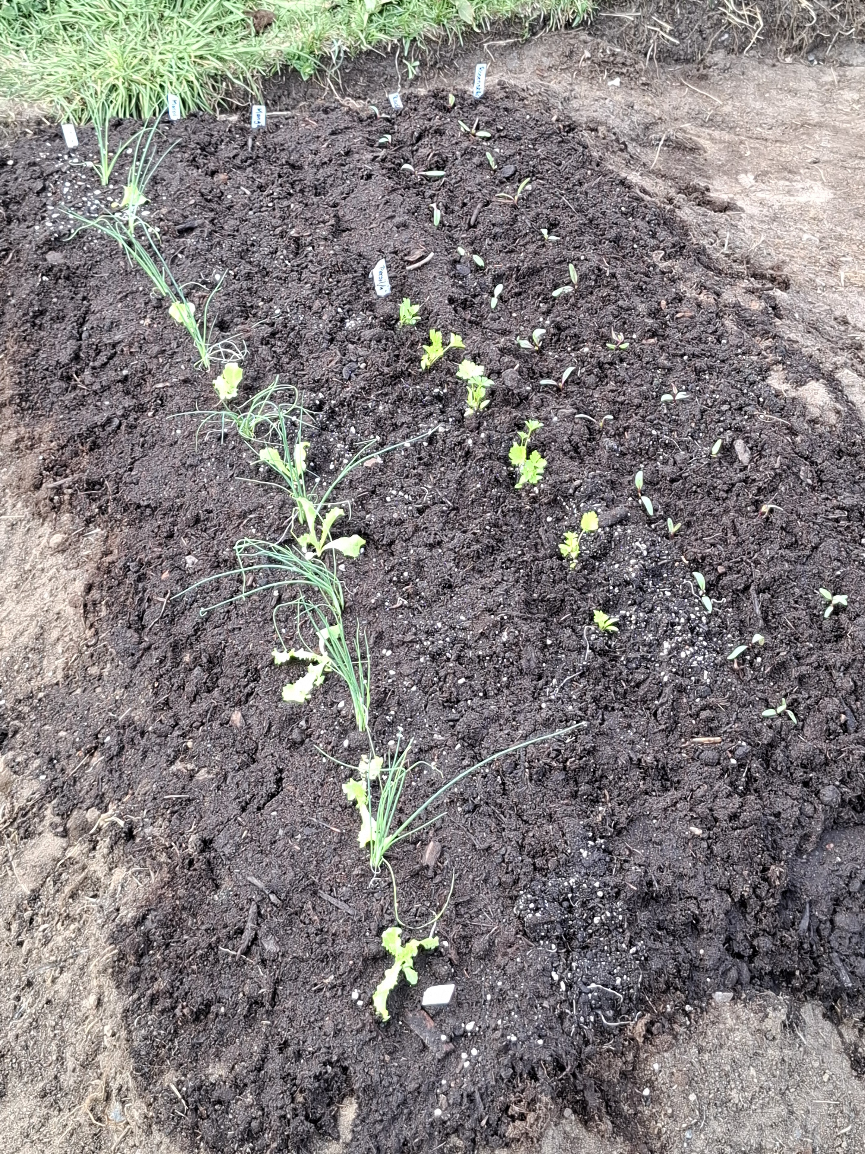Det ser inte mycket ut för världen ännu, men här är ett enkelt exempel på hur jag brukar försöka maxa den odlingsyta jag har, vare sig det är på öppen odlingsyta eller pallkrage. Jag sår och sätter ned uppdriva plantor med tanke på hur de växer för att få plats med så mycket som möjligt. Längst till vänster har jag satt ut små kluster med sommarpurjolök (4-5 st i varje liten rugge) med ungefär 10 cm mellanrum. Däremellan satte jag sedan försådda plantor av Frisésallat. Salladen skördas innan purjolöken men det finns fortfarande plats för båda sorterna att växa. Purjolöken växer på i sina kluster och jag skördar några av dem vartefter när de är i storlek av salladslök och använder dem just som sådana då. Sedan står en eller två purjolökar i varje kluster kvar och växer sig stor. I ytan bakom dessa har jag sedan sått en radda med morot, sått lite mangold samt planterat ut lite försådd persilja och bakom dessa lite försådda rödbetor. Och så blommor i båda ytterkanterna - en blandning av blommor som sniglar inte tycker om i framkant och rosenskära längst bak. Vi får se längre fram vad som blev bra och vad som inte funkade. Det är lite det som är tjusningen också, just att man aldrig riktigt vet. Just i år gör jag ett nytt försök med ett öppet trädgårdsland. Får se om det funkar så här eller om det blir odlingslådor där också till nästa år.