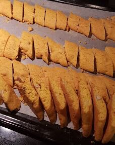 - Låt biscottin torka under 30 min i ugnen och vänd sedan andra snittytan upp. Låt torka ytterligare 30 min. Alltså en total torktid på 1 timma.